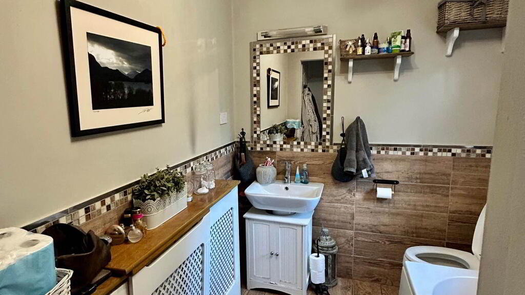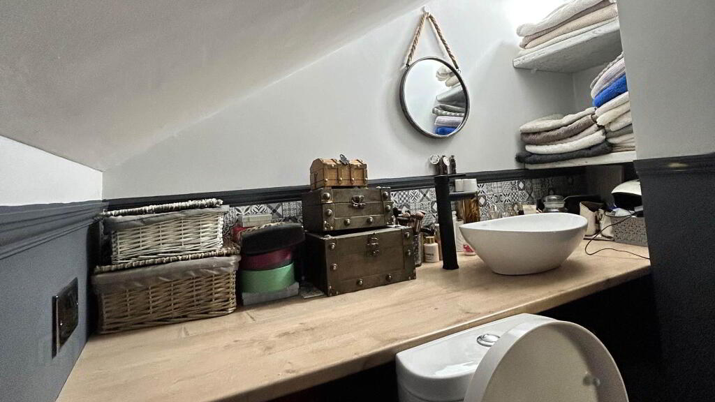 Bathroom - 3.03m (9'11") x 1.09m (3'7") Tiled floor, WHB, WC, Bath, Electric shower over bath, Vanity unit under whb